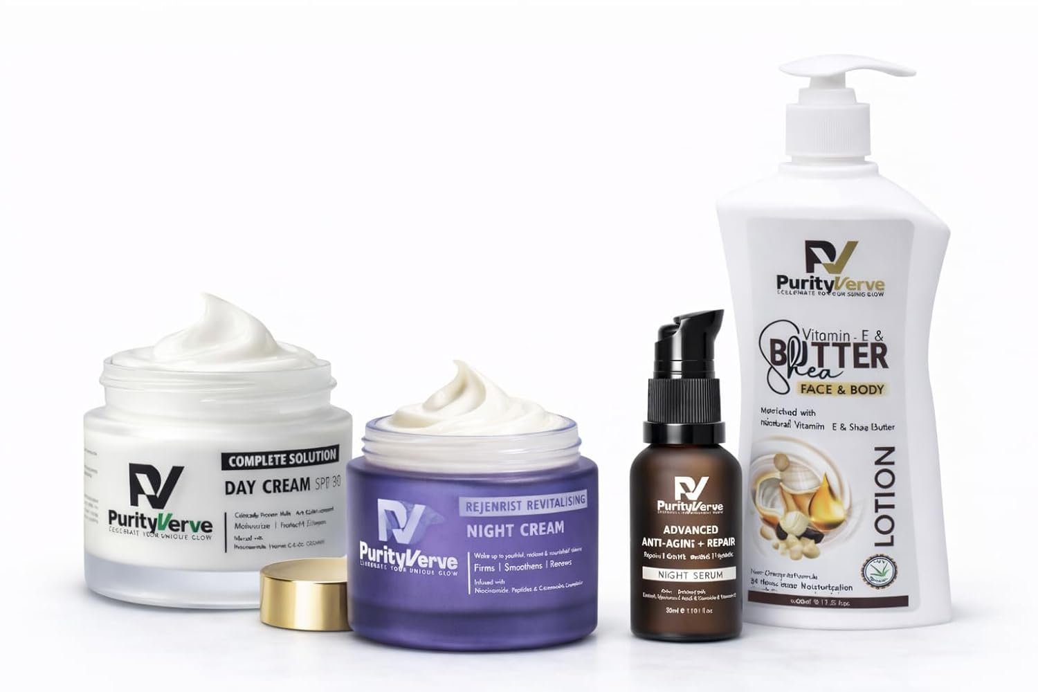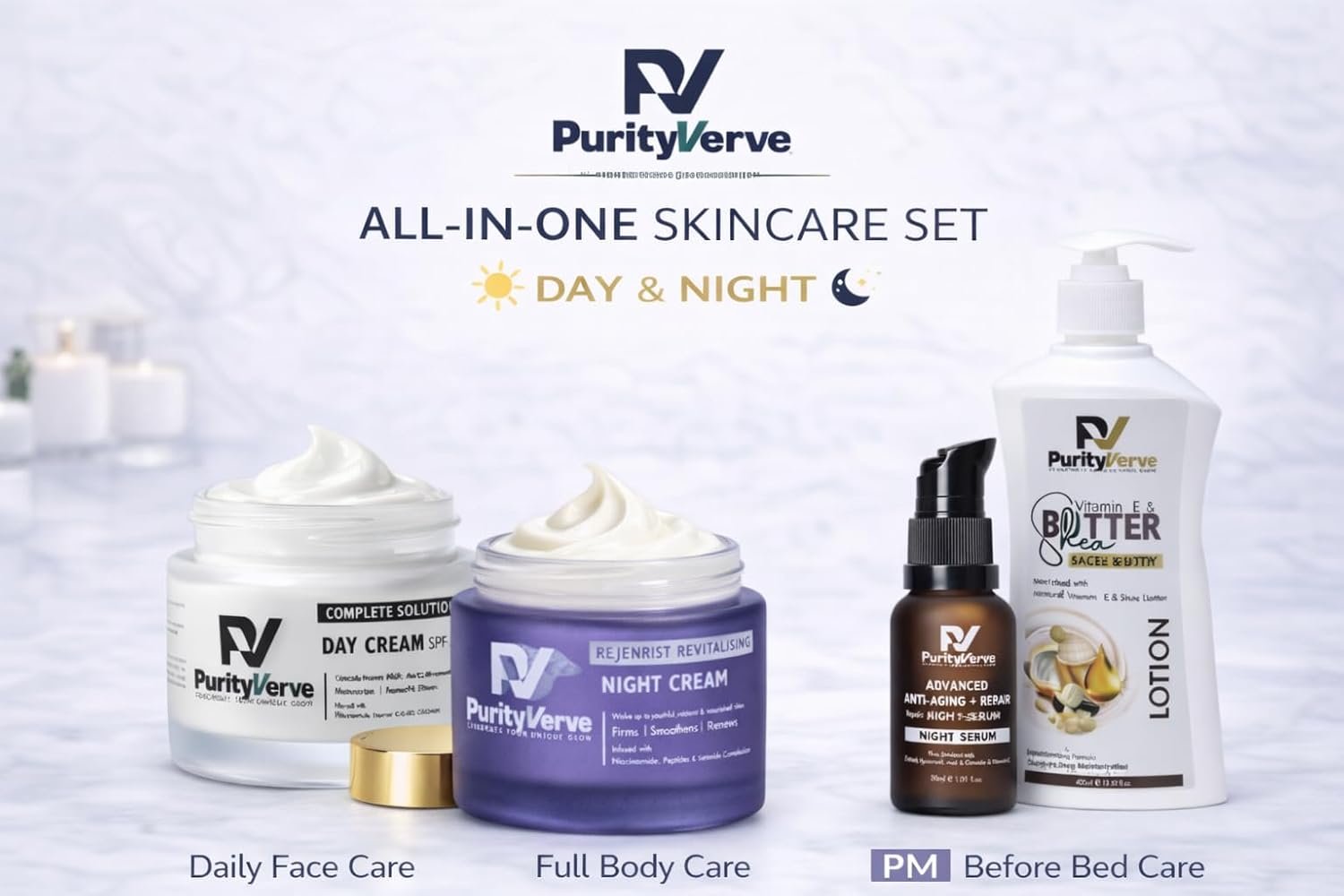 Consistent skin care requires the right products at the right time. The PurityVerve Complete Day & Night Face & Body Care Set is designed as a simple, structured routine that supports skin throughout the day and night. The SPF 30 Day Cream helps hydrate and protect facial skin from sun exposure during the day. At night, the Retinol-based Night Serum works to support skin renewal and improve texture, followed by the Repairing Night Cream with Peptides and Ceramides to restore moisture and strengthen the skin barrier. The Shea Butter Body Lotion completes the routine by providing daily hydration for arms, legs and body. Used together, this set helps maintain balanced, comfortable and well-nourished skin