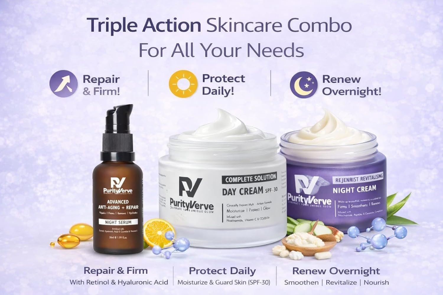 Healthy skin depends on consistent care during the day and effective recovery at night. The PurityVerve Complete Day & Night Face Care Routine is designed as a structured system that addresses daily protection, overnight repair, targeted treatment and deep nourishment in one comprehensive set. The SPF 30 Day Cream helps hydrate and protect skin from sun exposure and environmental stress during the day. At night, the Retinol-based Night Serum works at a treatment level to support skin renewal and improve texture. The Night Cream follows to restore moisture and reinforce the skin barrier with Peptides and Ceramides.