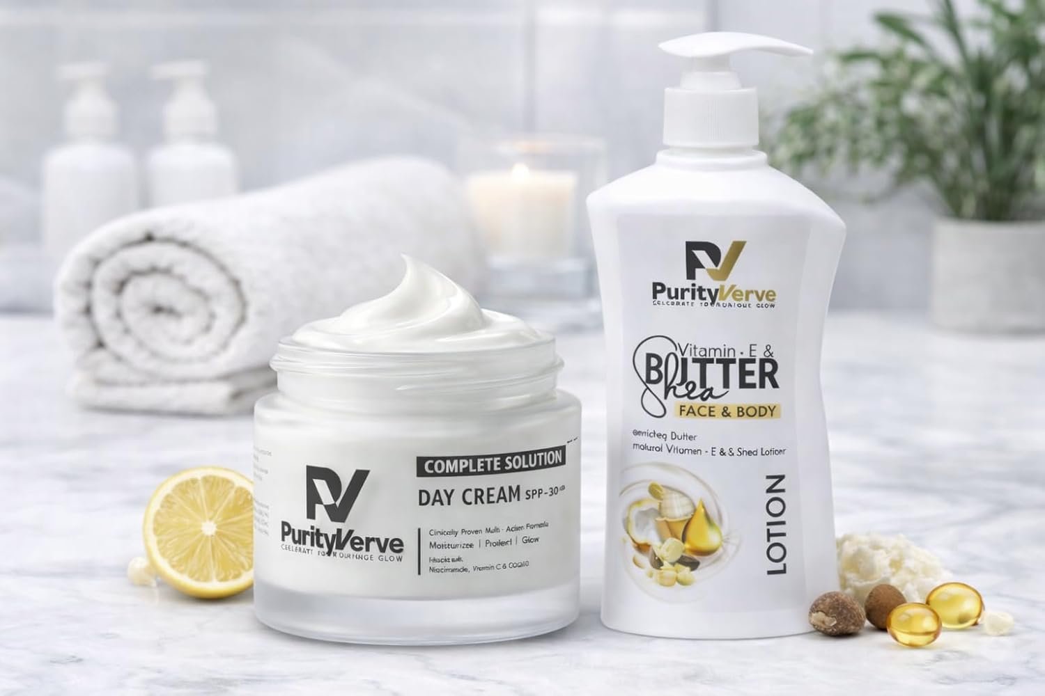 Daily exposure to sun, pollution and frequent bathing can leave skin feeling dry and dull. The PurityVerve Daily Care Combo is designed to simplify everyday skincare with reliable hydration and daytime protection for both face and body. The Body Lotion, enriched with Shea Butter and Vitamin E, helps restore moisture and maintain soft, smooth skin throughout the day. The Day Cream complements this routine with SPF 30 protection and a blend of Niacinamide, Vitamin C and CoQ10 to support hydration, brightness and antioxidant defense. Used together, this combo helps maintain balanced, comfortable and healthy-looking skin with minimal effort.