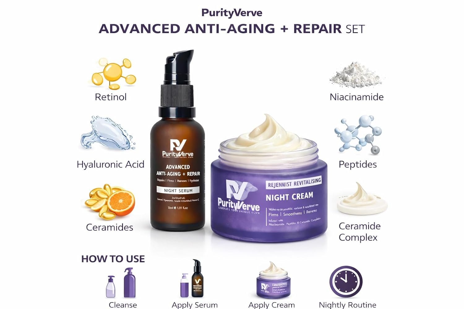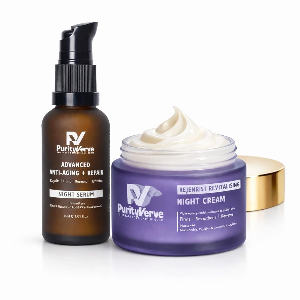 Skin repair processes are most active at night, making it the ideal time to introduce corrective and restorative ingredients. The PurityVerve Night Repair Combo combines a Retinol-based Night Serum with a nourishing Night Cream to support visible skin renewal while maintaining hydration and comfort. The Night Serum works at a treatment level to improve texture, smooth fine lines and promote cell turnover. Hyaluronic Acid and Ceramides help offset dryness often associated with retinol use. The Night Cream follows to reinforce the skin barrier with Niacinamide, Peptides and Ceramides, helping the skin feel replenished and balanced by morning. Best suited for regular night routines and users seeking targeted overnight care